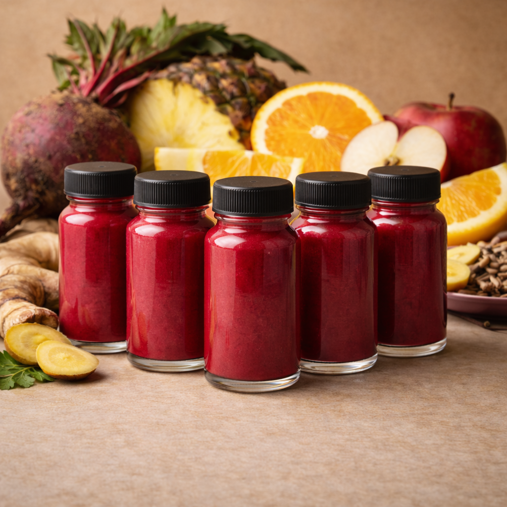 Beet fuels blood flow and stamina. Pineapple and orange provide bright immune support and digestive enzymes. Red apple adds grounding antioxidants, while ginger and lemon activate circulation and support detox pathways.
