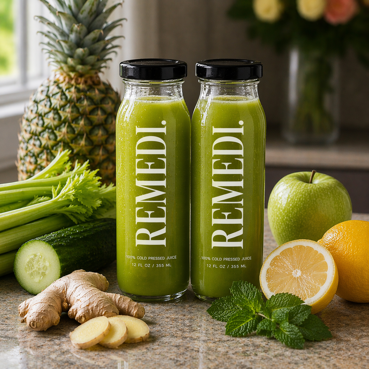 Celery helps flush excess fluid and supports natural detox pathways. Cucumber deeply hydrates and cools the body. Green apple adds light sweetness and supports digestion. Pineapple provides enzymes to ease bloating. Ginger activates circulation and digestion. Lemon supports liver function and alkalinity. Mint cools and soothes the digestive system while refreshing the palate.